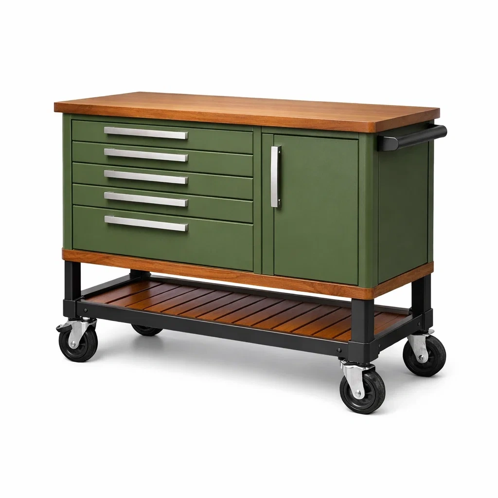 Chariot à outils en métal avec plateau en chêne et 4 tiroirs vert noir 120 cm
