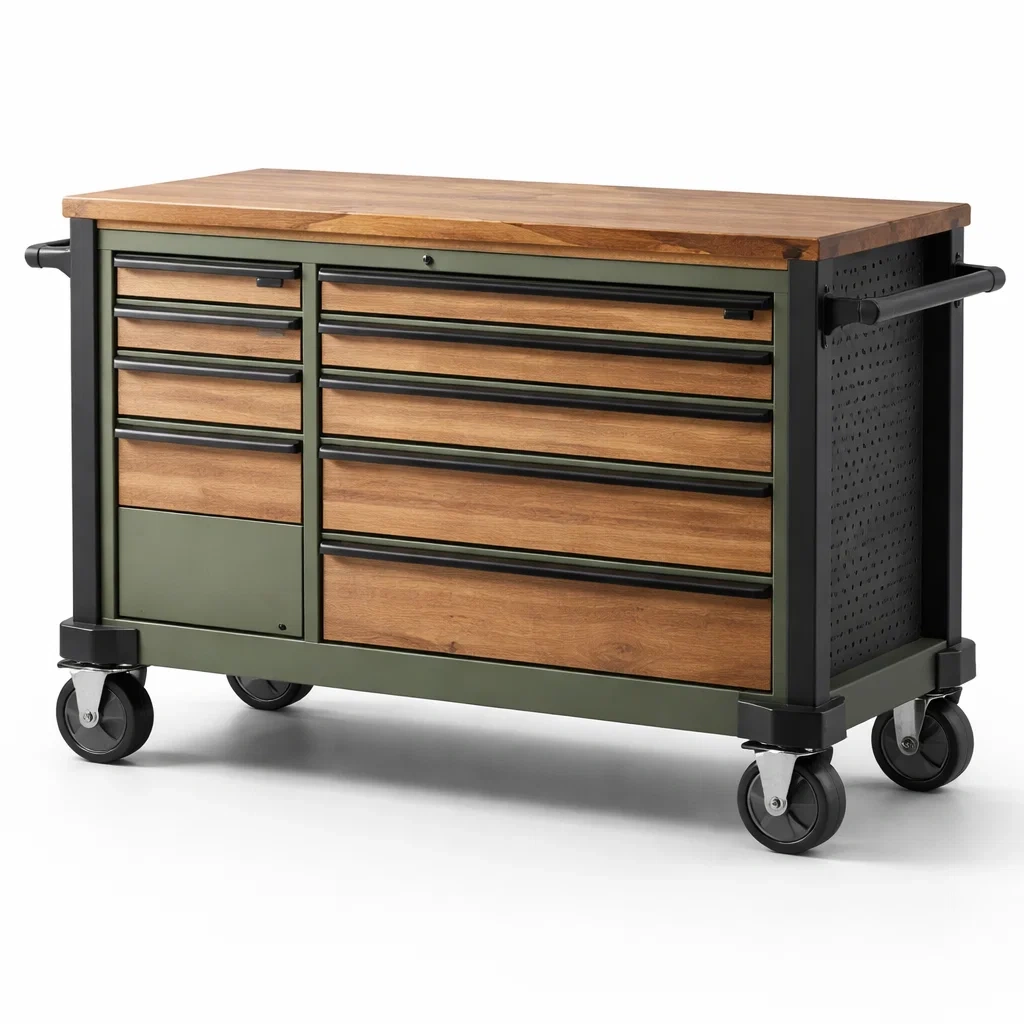 Chariot à outils mobile en bois et métal avec 9 tiroirs