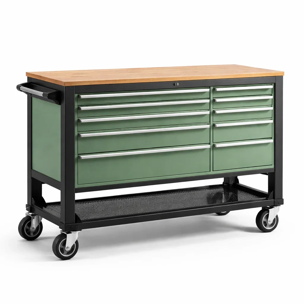 Chariot à outils en métal avec plateau en bois de hêtre et 10 tiroirs 140x45x95 cm