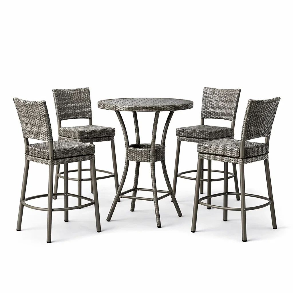 Ensemble de bar extérieur en résine tressée et aluminium avec table ronde et 4 chaises hautes gris