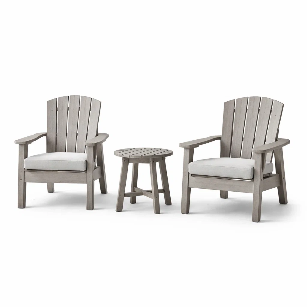 Ensemble de détente avec chaises et table ronde en bois gris et coussins
