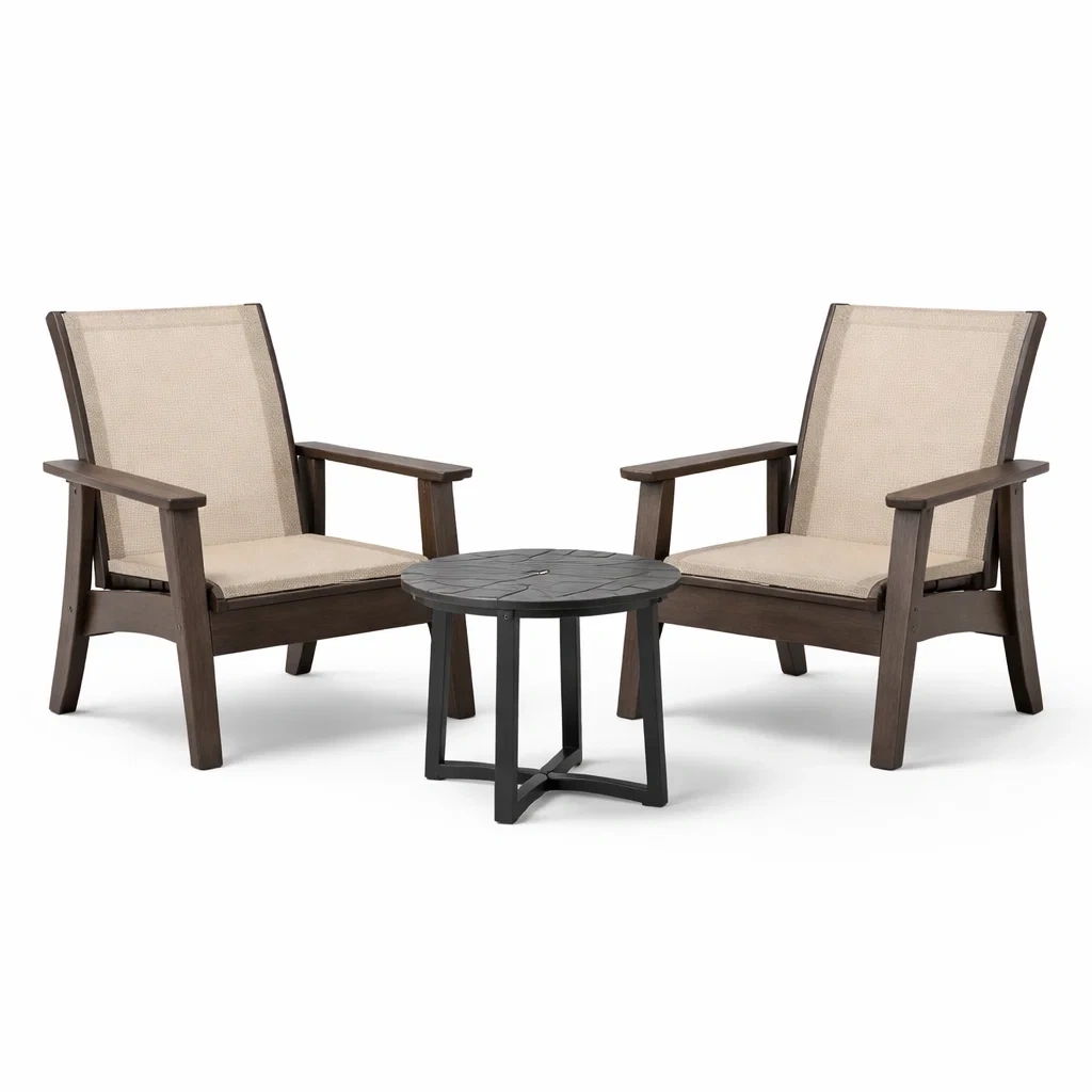 Ensemble de détente avec deux fauteuils à bascule et table ronde en bois beige avec tissu polyester