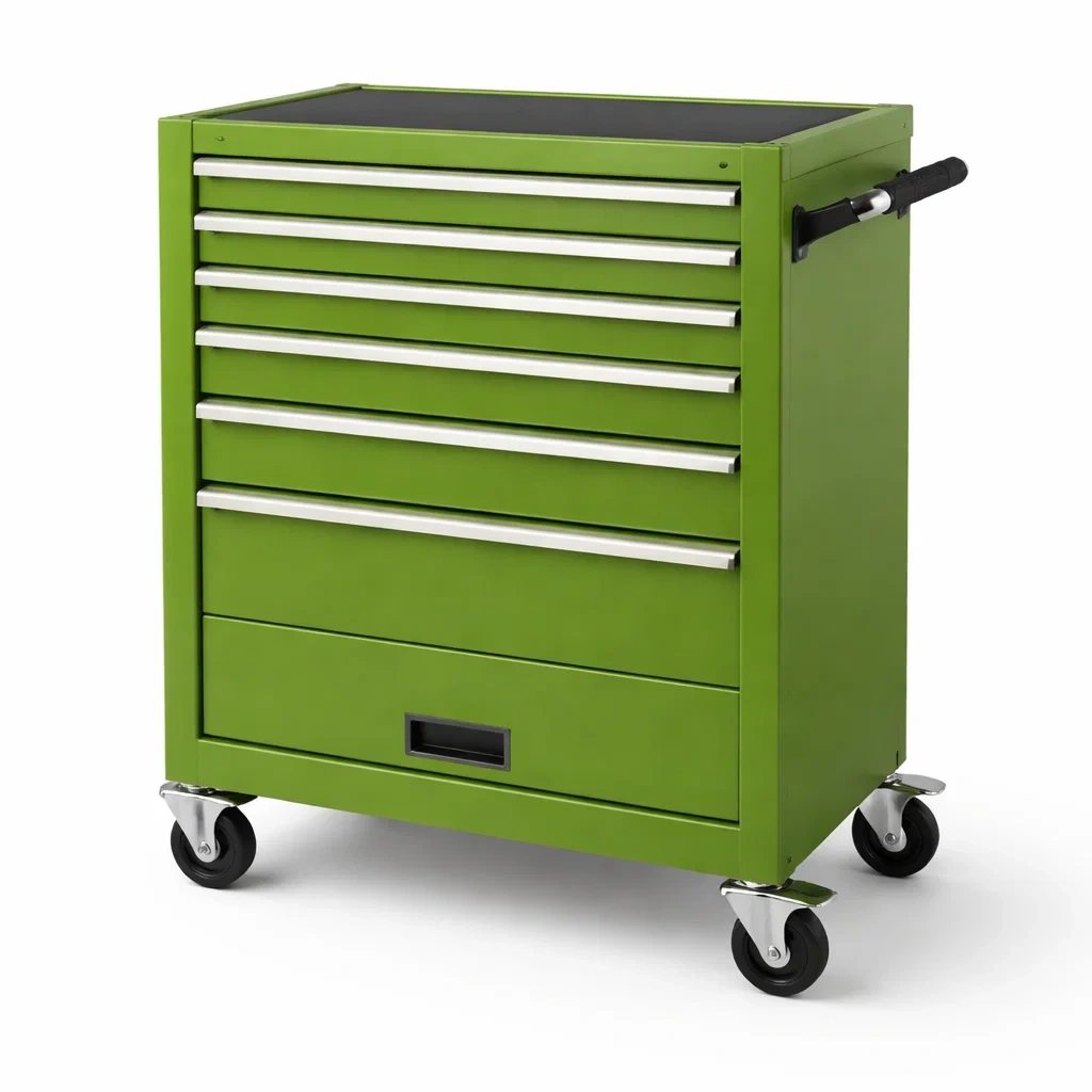 Chariot à outils doté de 7 tiroirs en acier avec finition en revêtement en poudre.