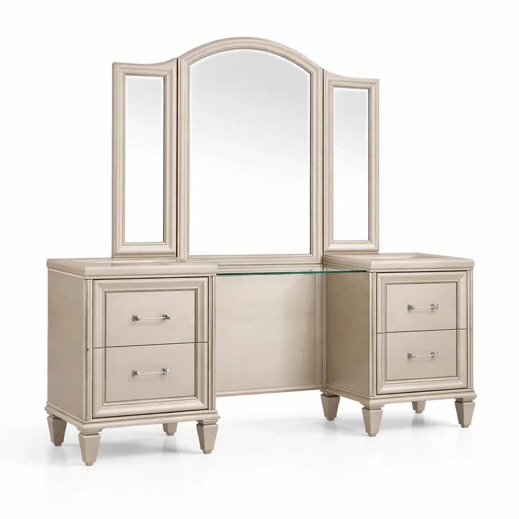 Cette coiffeuse intègre trois miroirs montés sur un cadre en bois, offrant une vue panoramique. Il est doté de quatre tiroirs pour ranger les effets personnels.