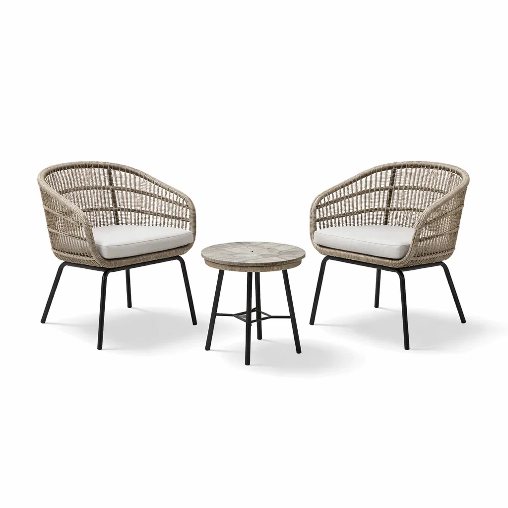 Produits inclus : 2 chaises en rotin avec coussins, 1 table avec plateau en bois